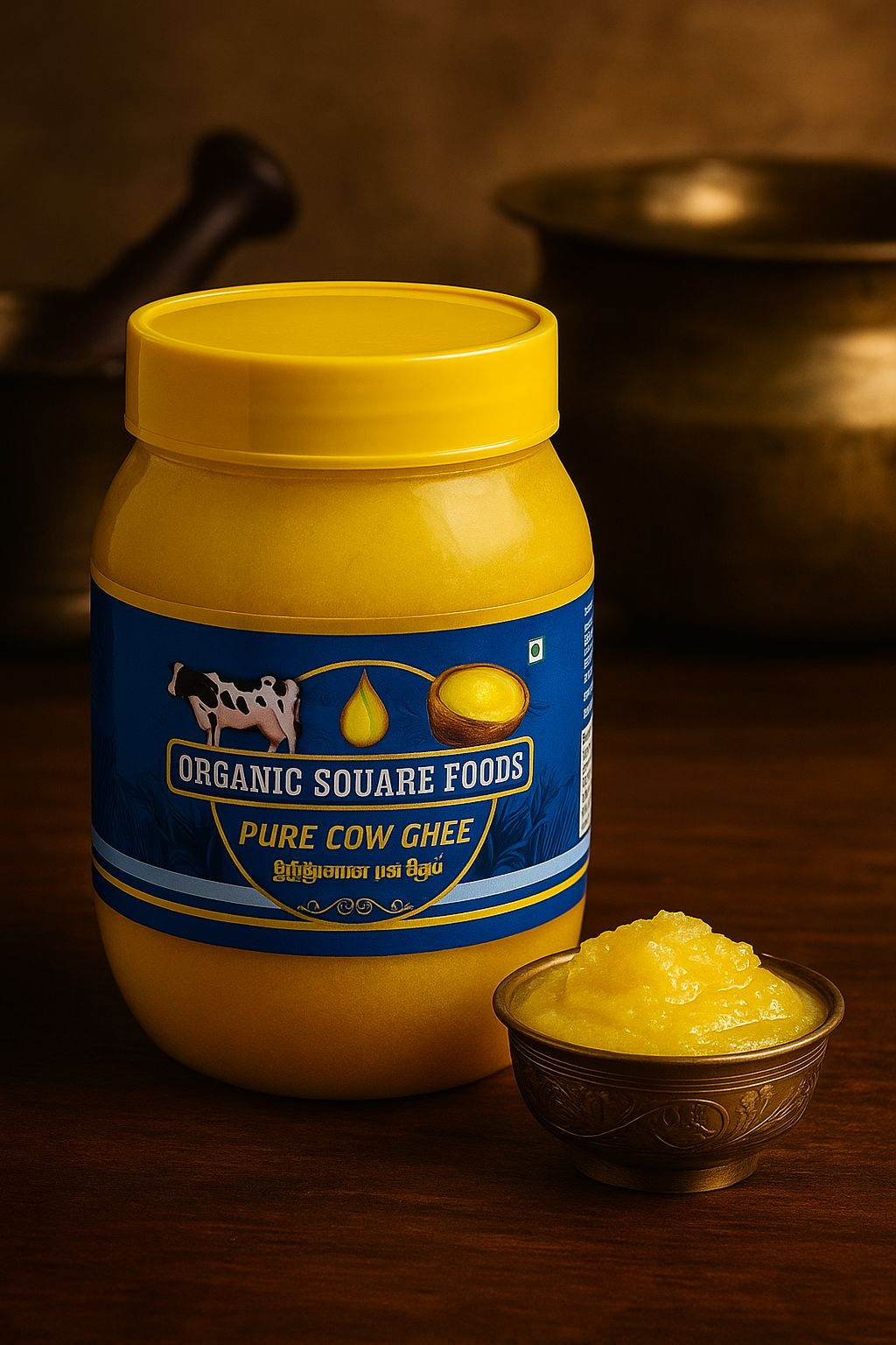 Our Pure Cow Ghee is traditionally prepared using the Bilona method, where curd is churned and slowly heated to preserve all nutrients and enhance flavor. This golden ghee is packed with health benefits and brings a rich taste to every dish.